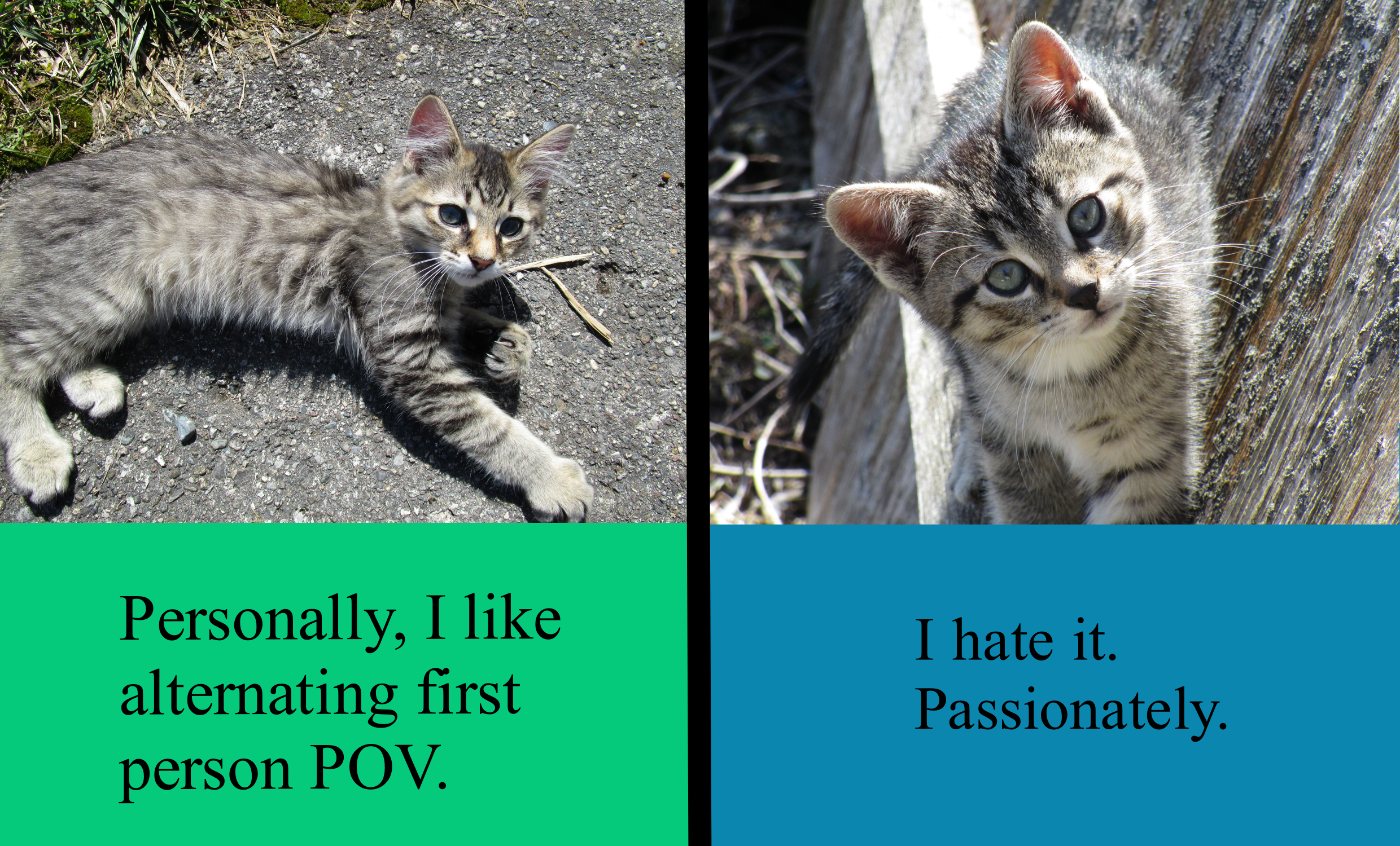 - If you desperately want to do two first person POVs, consider writing the first half of the book from Character One’s perspective, and the second half from Character Two’s perspective. I think this would allow readers time to settle in to each POV without being jolted or confused by constant switching back and forth.
